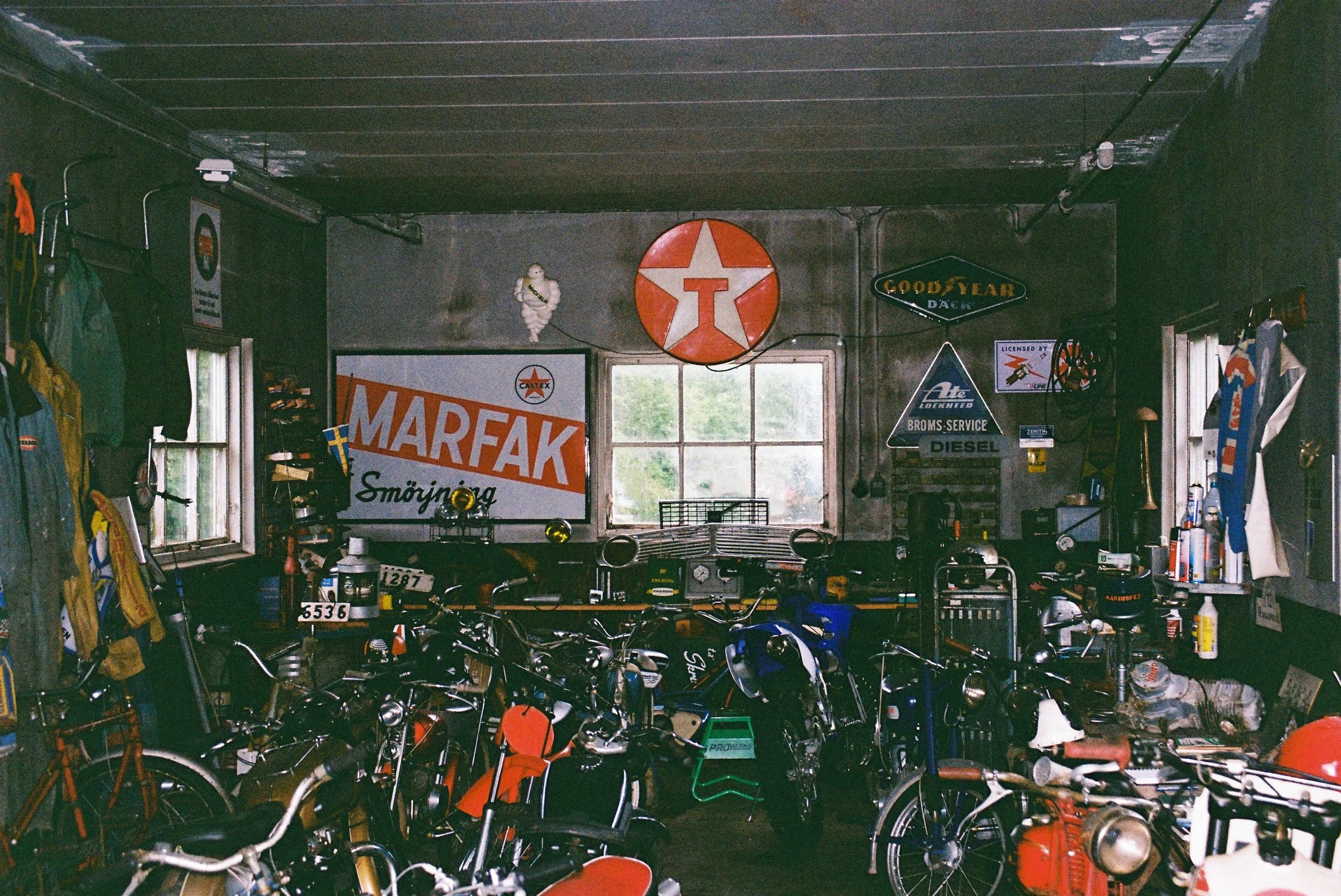 Väggarna pryds av tidsmärkta artefakter, en hyllning till alla de motorcyklar som väckts till nytt liv här.